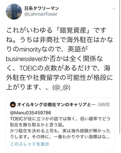 これは事実だと思います。ただ、TOEICの点数が高いだけで実戦で使い物にならなかった時が悲惨。チャンスを与えられて成長できる点は非常に良いですが。成長を待ってくれる環境かどうかも重要な気がします。 TOEIC800、私の妻の最初のターゲット。TOEIC900+海…