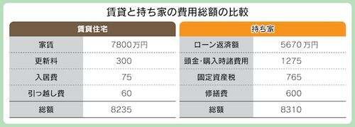 ローン金利 試算では年2% ※試算は制度変更が多い住宅ローン減税を勘案していないので、現状の減税規模が続けば持ち家が安くなる。逆に、600万円と見込む修繕費は持ち家の状態などによってはさらに上積みされる。 持ち家vs賃貸 支出総額、50年間で差はわずか7…