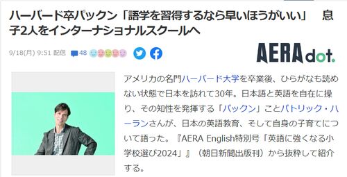ハーバード卒パックン「語学を習得するなら早いほうがいい」 息子2人をインターナショナルスクールへ (AERA dot.) - Yahoo!ニュース 【AERA English 特別号】英語に強くなる小学校選び 2024 (AERAムック) 朝日新聞出版 Amazon 「【AERA English 特別号】英…