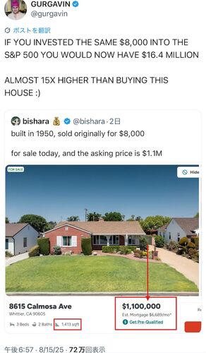 「1950年に8000ドルで建てられた家が、今日では110万ドルで売りに出されている。 もし同じ8000ドルをS&P 500に投資していたら、今頃1640万ドルになっていたよ。 この家を買うよりも約15倍も高いね :) https://x.com/bishara/status/1956113504941039740?s=46…